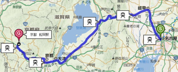 (まずは名古屋から山陰本線の船岡駅を目指す)