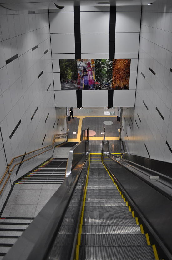 (改札口から東西線ホームへ。既設の南北線が地下3階、東西線は地下4階です)