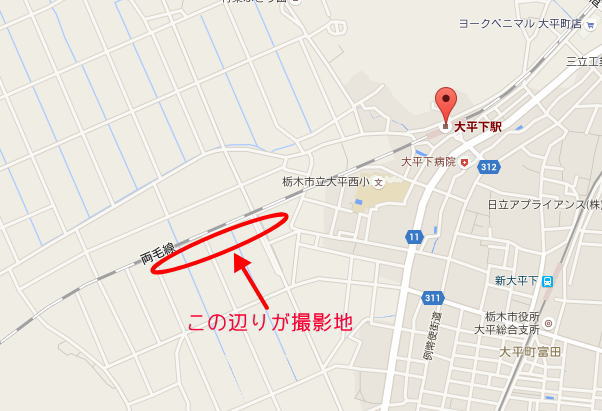この辺りが撮影地。奥が岩舟駅、手前が大平下駅です。