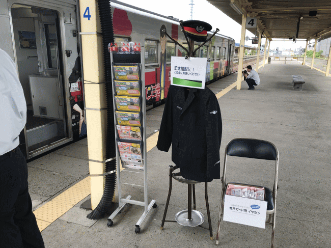 釧路駅の花咲線の発車ホームでは、釧路の駅員さんが「いつもの列車で観光気分」を盛り上げようと頑張っていました。具体的な説明や、駅員さんの制服を着て写真を撮るサービスなどがあり、私も制服を着用して記念写真をパチリ(^^♪