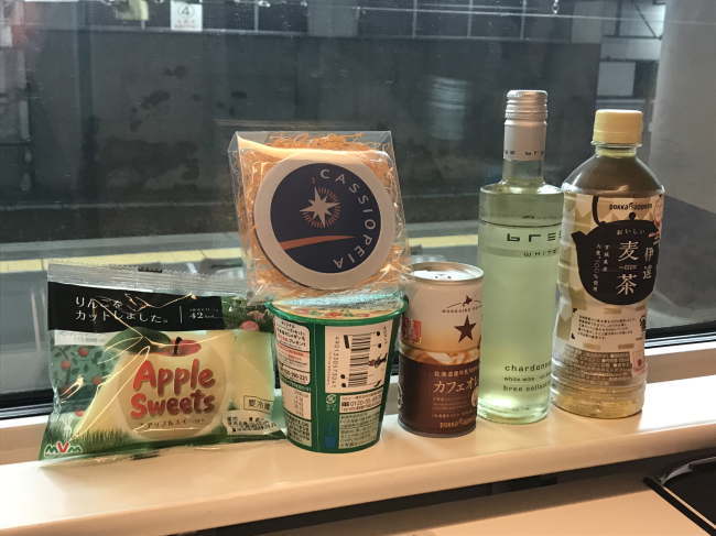 ダイニングカーもラウンジカーも両方で楽しんで、それでもまだ飲み足りない気分になって、ラウンジカーの売店を利用しました。じゃがりこやカットリンゴなどをおつまみ代わりに、ブリーホワイトという白ワインを飲んでいます。