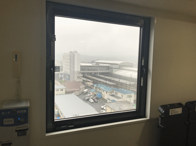 部屋の窓辺から、青森駅方面を眺めたところです。まどは網目ガラスが無念ではありますが、これは仕方がありません。完全に開いた場合は腕一本は外に出せる状態になりますが、撮影をするには機材の落下の可能性があるので、何度も行う事は憚られます。