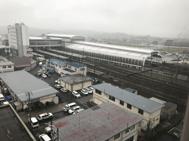 今回は、最上階の9階の部屋をあてがってもらいました。図に向かって下側が青森駅方向で、上側が八戸駅方向です。フロントのスタッフさんの対応が非常に良くて、鉄道を眺めたいという当方の要望をきちんと聞いてくださって、本当にありがたいなと感動しました。