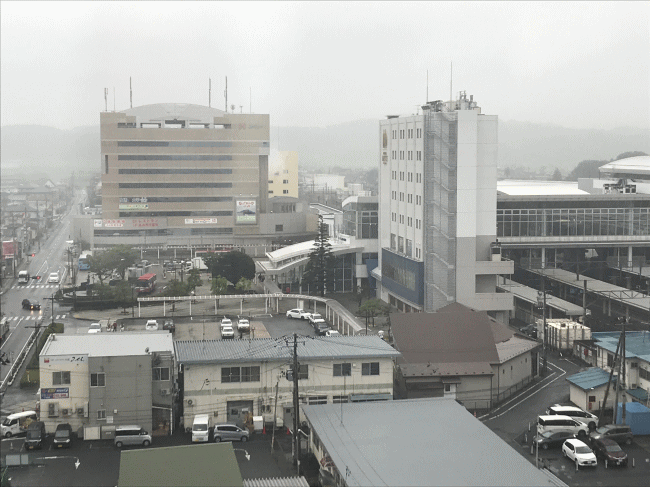 なお、八戸駅側で線路沿いの高層階を予約すれば、八戸駅側のトレインビューとなります。以下は、エレベーターホールから見た八戸駅方向の景色です。