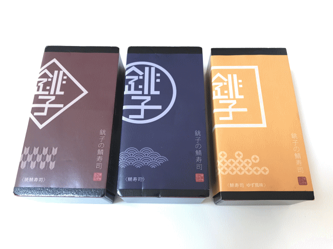 3種類の鯖寿司は、掛け紙も含めてこのような外観です。左から、焼き鯖寿司、鯖寿司、鯖寿司ゆず風味となります。洗練されたデザインですね。