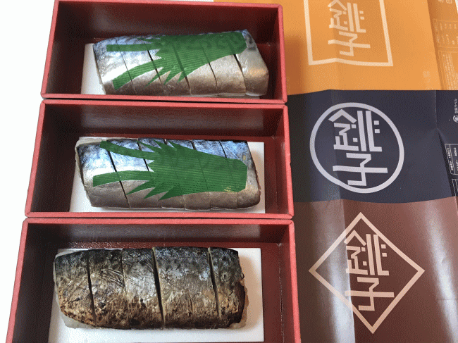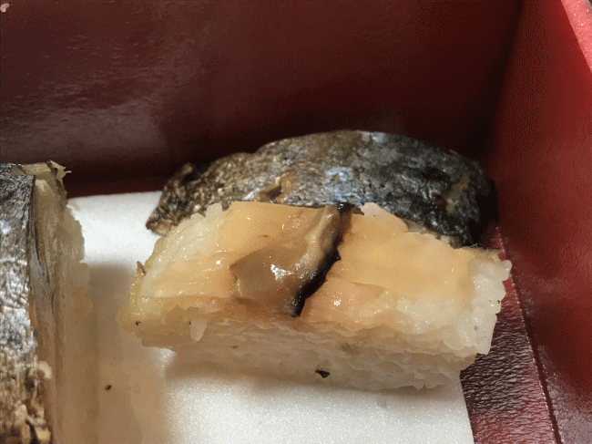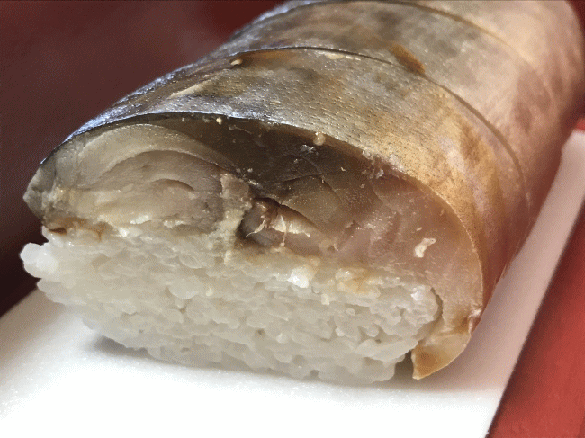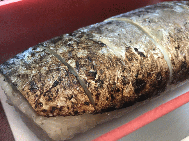 焼き鯖寿司です。ちょうど良い頃合いの焼き加減ですね。
