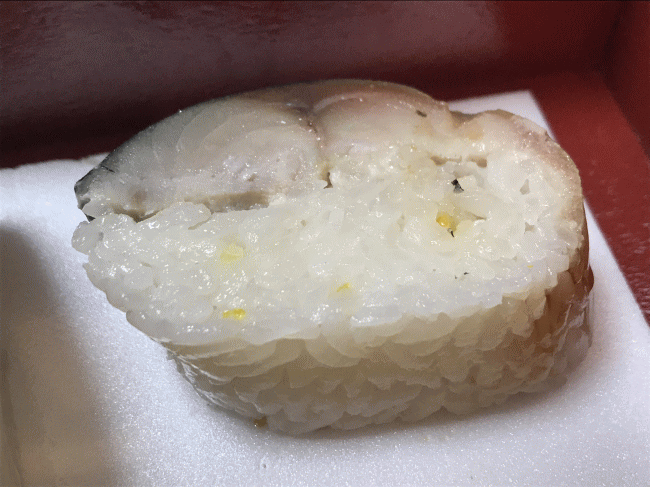 最後はゆず風味の鯖寿司です。柚子の粒々が銀シャリの中に見て取れます。そして、これがまた絶品なのです。柚子が入る事で、わずかに感じる鯖の生臭さが払しょくされます。