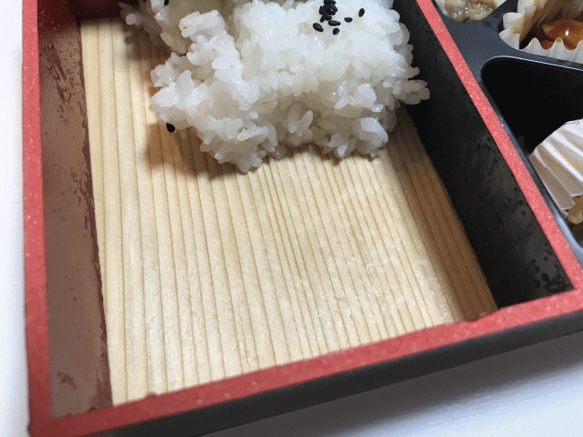 お米の余計な水分を吸収するため、プラスチック容器の底に経木を敷いているのも、崎陽軒のこだわりです。水分たっぷりのご飯を平気で出してくる、某駅弁屋さんも見習って欲しい心遣いです。
