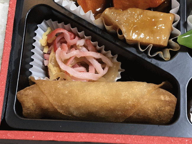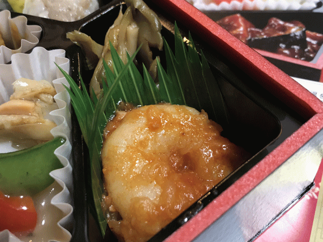 同じく、冷めても美味しいエビチリ。辛味と甘みの調和がとれています。チリソースが液状すぎると駅弁としては問題なので、上手に工夫していますね。さりげない、駅弁屋の技術です。
