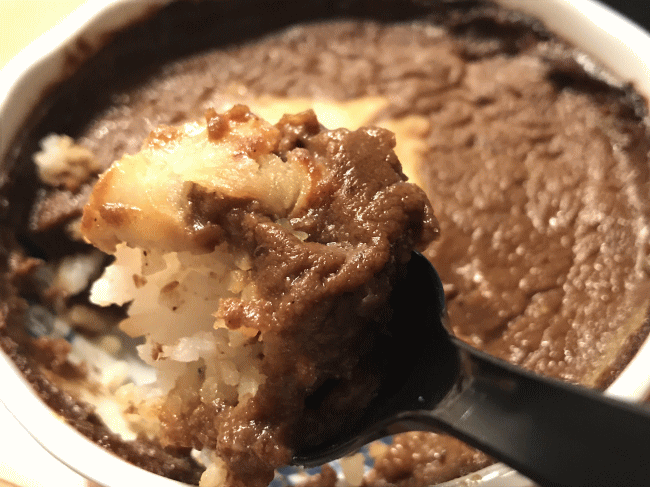 今回はホテルの部屋で食べたので、冷めた状態のままで頂きました。レンジで加熱した状態は1つ上の項で見て欲しいのですが、やはりカレーの表面の滑らかさなどはかなり違ってきますね。