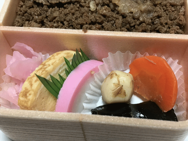 下記は、2015年に娘と一緒に食べた時の中身です。真上から見ると、牛肉の煮つけと牛肉のそぼろがバランスよく並んでいるのが分かります。副菜として、里芋や人参の煮物、卵焼きや蒲鉾が入ります。