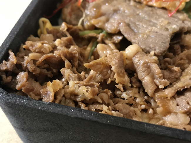 ご飯の上にモヤシなどのビビンバを敷いて、その上にいつもの醤油味の牛肉そぼろを敷き、更にその上に風味付けをした牛焼肉を配しています。やまくらべの醤油漬けを添えて、色合い的な演出もしています。