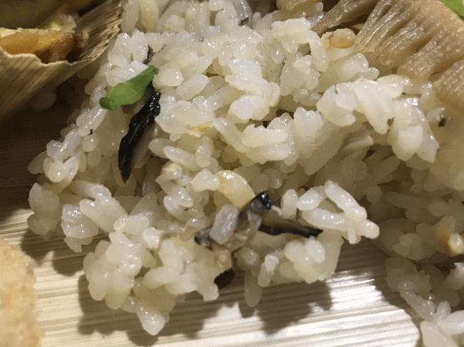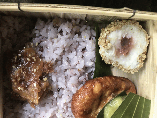 黒米のご飯の脇には、中に梅肉の入った里芋の揚げ物が入っていました。もっちりとしながらもサッパリとした不思議な味覚です。ご飯の上には、生姜の佃煮が乗っています。佃煮といっても、霧島産の生姜と言うのがユニークですね。