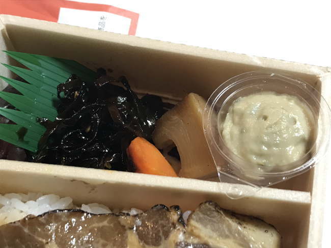 しかもこの通り、肉の厚さはペラペラで、必死こいて面積だけは何とかしたといった感があります。しかし、私はこの駅弁が猛烈に好きでして、豚肉に絡んだ甘めのタレと、豚肉そのものの風味、そして豚の脂身が三位一体となって、今風に言えば明らかに、B級グルメの味わいです。