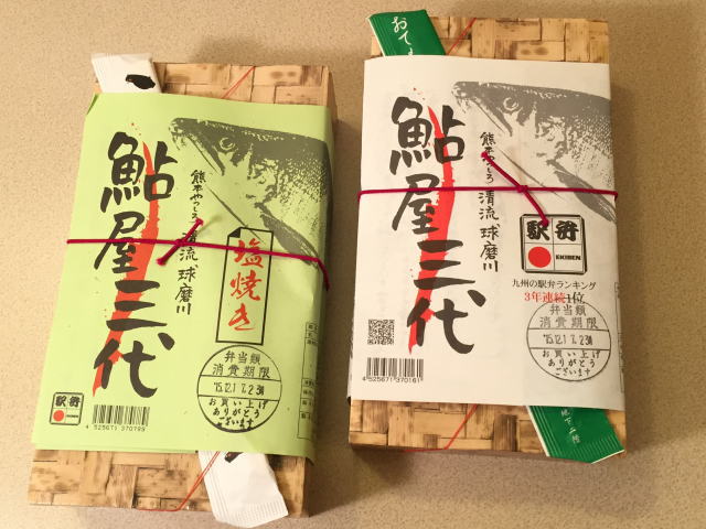 2015年末、ブルートレインたらぎの宿泊と、肥薩おれんじ食堂のクルージングディナーを目的として九州に行った際に、旅行初日に熊本駅で発見して、問答無用で購入した駅弁が、超有名な鮎屋三代です。