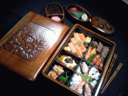 個室に入って待つこと10分くらい、豪華な入れ物が運ばれてきました。あまりの存在感に、これを見た時は口をポカリと開けてしまいましたよ・笑。このお弁当箱こそ、数万円は下らないだろうと思われる、日光彫りです。