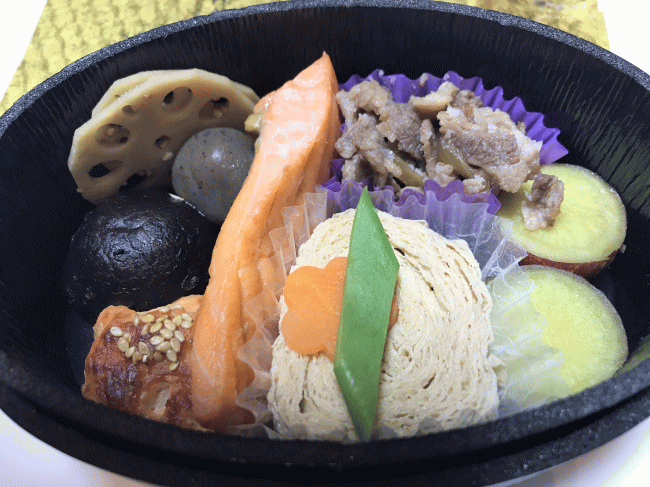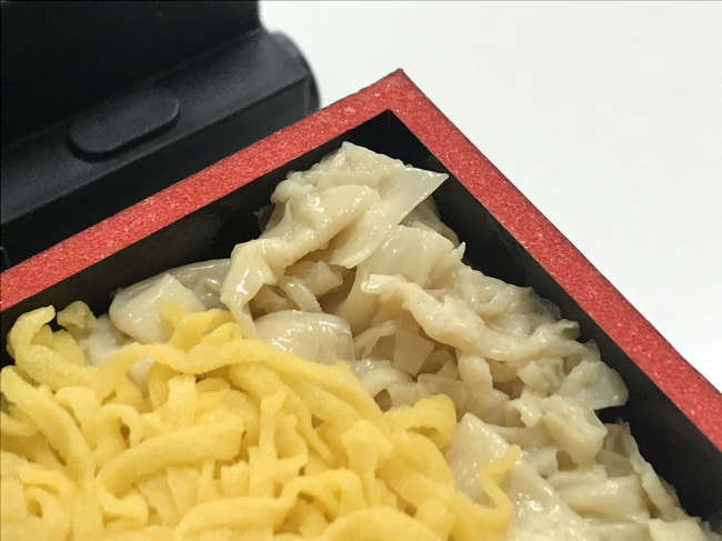ご覧の通り、黒い容器(発泡プラスチック製)が縦に長く、二段重ねになっています。この形を見て、私がすぐに連想したのは、茨城県水戸駅の駅弁、印籠弁当です。リンク先を見て頂くと、かなり似ているのがお分かりになると思います。