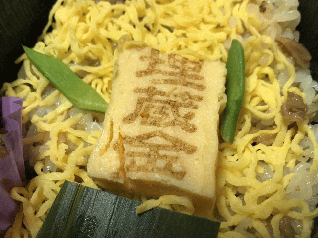 以前に食べた日光埋蔵金弁当のご飯が「ゆばと舞茸の炊き込みご飯」だったのに対し、SL大樹バージョンのご飯はちらし寿司となっています。埋蔵金と書かれた玉子焼きのインパクトが凄いです。付属のスプーンを使う事で、埋蔵金を探すかのような楽しみがあります(^^♪