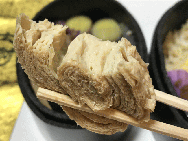 ゆばと言えばこちら。玉子焼きかと思いきや、揚げ巻きゆばです。ゆばの淡白な味わいを堪能できます。ゆばを駅弁にすると(例えばその後に食べたゆばちらし寿司など)、ゆばに必要以上に濃厚な味付けをしてしまうので、ゆば本来の味覚を損なうんですよね。これは、そんな事はない。