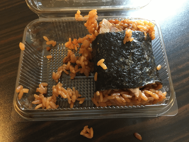 が、食べようと思ったら、箸が付いていませんでした・涙。おにぎりだから箸が無くてもOKなのかな、と思って手づかみしたら、とてもじゃありませんが手では食べられない硬さで、口に入れようとすると、そのまま口に入るものが半分、手から零れ落ちるものが半分と言った有様でした。