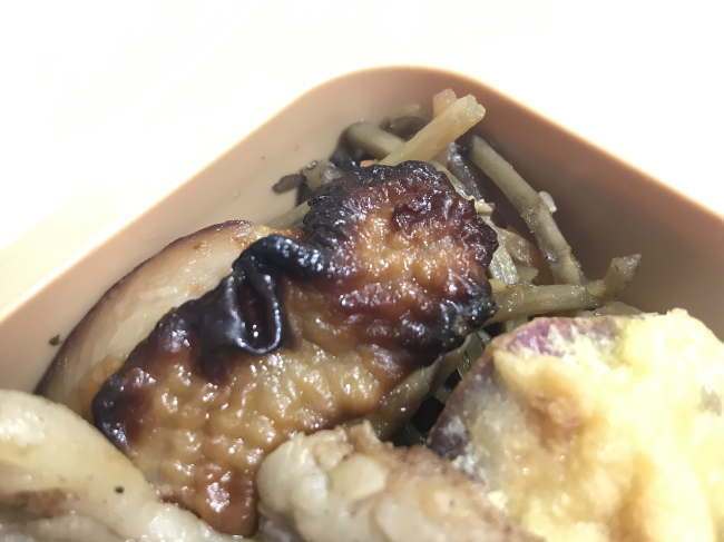 天ぷらの左には、つくば鶏の照り焼きも入っていて、肉類が多い豪勢な駅弁に仕上がっています。だれもが満足する内容だと思います。当然、つくば鶏も茨城県産。その下に見えるきんぴらごぼうだけが、茨城県産を名乗っていないメニューです。