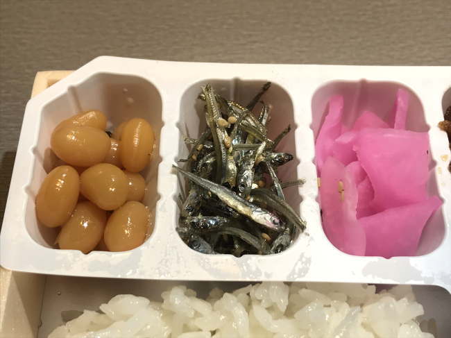 付け合わせ的に、煮豆やいかなご、漬物など。全体として、駅弁を食べながら、ビールやハイボール、日本酒を飲むのにも最高の幕の内だなと感じました。もちろん、私もビールをグビグビと飲んだのでありました(^^♪