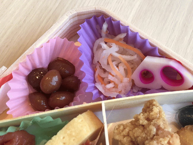 口直し的には、大根の酢の物や酢蓮根がさっぱりしていて良いですね。煮豆は甘く、時折、口の中に1粒づつ入れて食べる感じです。