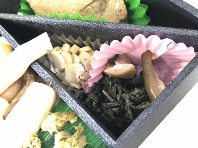 全体を見渡したところ、海老を抜かすと肉や魚類は一切なく、これほどまでに動物性たんぱく質の存在しない駅弁は、稲荷寿司のような駅弁を除くと、全国でも極めてレアだと思います。 越後湯沢駅のくるみ山菜寿司が、これにだいぶ近いなと思い出しました。