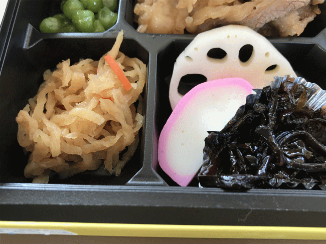そして御開帳。中身も、思ったよりもシンプルな印象です。でも私、こういった「昔風の盛り付け」を感じられる駅弁、大好きです。牛のすき焼き以外は、切り干し大根、蓮根、蒲鉾、昆布の佃煮、そしてうぐいす豆に漬物で、すき焼き以外は洗練さを感じないのもまた佳しです・苦笑。