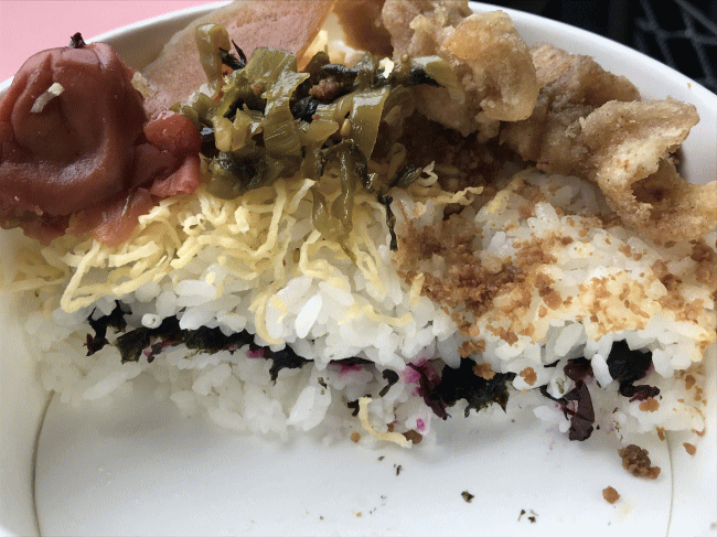 そして、さらに工夫が有ります。ご飯の間に、ゆかりを敷いているのです。このゆかりの梅しそ風味が口の中に広がると、紀州うめどりからまるで本当に梅の香りが立つような、そんな錯覚に踊らされるのです。