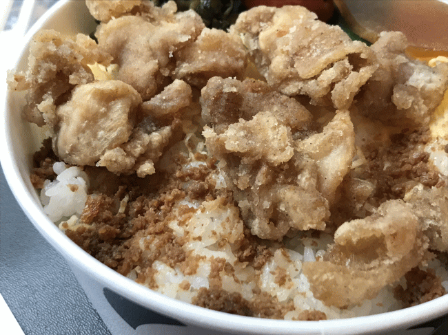 でも、大好物には手が伸びます。鶏の唐揚げをつまみ食いして見ると、例えば東京の唐揚げざんまい弁当のような大ぶりの唐揚げではなくて、岡山駅のいいとこ鶏弁当のように、小さくした状態の唐揚げですね。