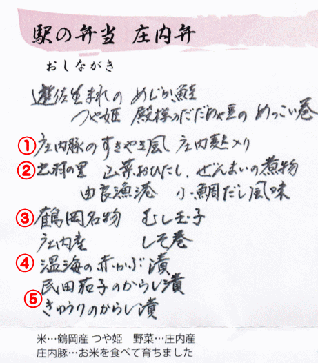 この庄内弁はそもそも、食の都庄内親善大使の土岐正富さんが監修したお弁当で、庄内の豊富な食材を徹底的に活かした意欲作です。遊佐町に生まれた「めじか」と、つや姫とだだちゃ豆ご飯を「めっこい巻き」にしたものがメインであり、その解説がきちんと書かれていました。