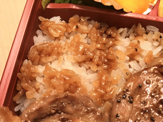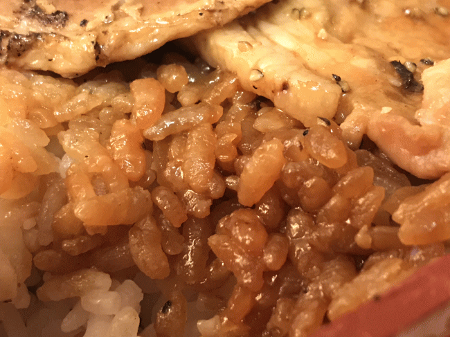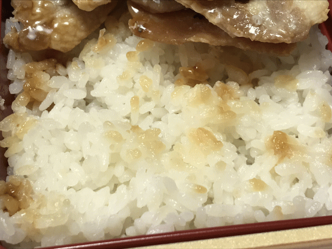 豚丼のタレが付いたご飯です。炊き加減も問題無く、美味しく頂きました。