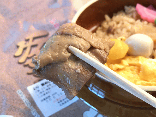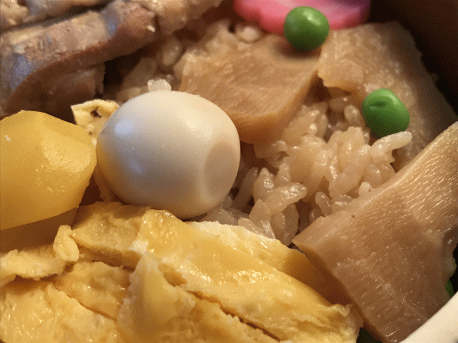 基本的に3つの釜めしのご飯は具が同じ内容で、鶏肉の部分だけを入れ替えて、えび釜めしにしたり、ほたて釜めしにしたりしています。鶏肉煮のほかに、錦糸卵、筍煮、栗の甘露煮、うずら卵、蒲鉾、グリーンピースが乗っています。
