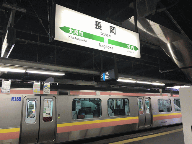 越後長岡喜作弁当を買い、乗車したのはE129系電車です。すっかり新潟県の主力の新型車両となっており、都会の雰囲気と全く違いがありません。JR東日本は、管内全てにこのような座席を配置するようです。クロスシートであるだけ、ありがたいとも言えますね。