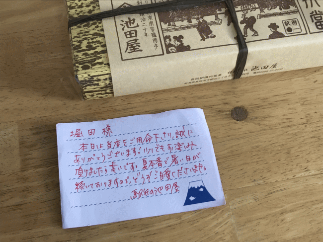 予約すると、このように駅弁屋の若女将が手書きのメッセージを書いてくださいます。このお心遣いは大感動ですし、接客にあたる若女将の明るい雰囲気も良く、「ああ、また買いに来たいな」と強く感じました。