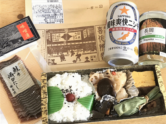 今回、池田屋さんの駅弁売り場のすぐ後ろに日本酒の専門店がありましたので(本ページ後段でご紹介)、そこでワンカップやおつまみも買って、新津駅前でビールも買って、お酒と共に越後長岡喜作弁当をたっぷりと楽しみました。いい感じでしょ。