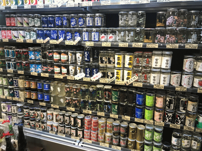 ワンカップ酒のコーナーも、このようにあります。カラフルであり、見ているだけでも飽きないですね。さんざん悩んで、鉄道ファンだという事から、「長岡駅名板」が描かれたお酒を買ったという訳です。