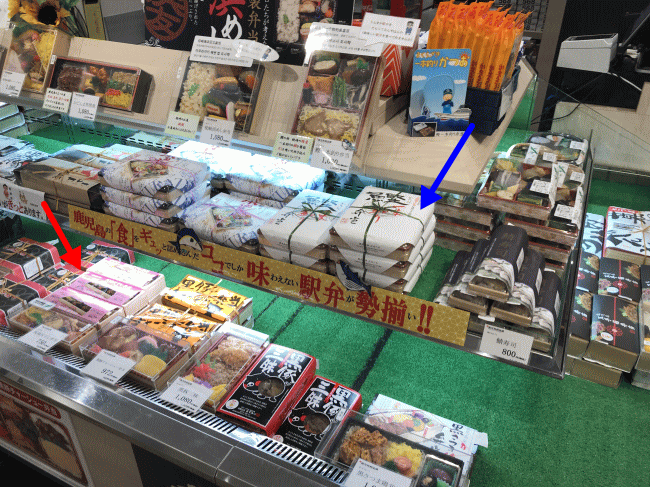 本ページでは、赤い矢印の部分の桜島灰干し弁当をご紹介します。この時に同時に購入した、鰹一本釣り弁当(青印)も並んでいます。1枚の写真では収まりがつかない品数が陳列されていますので、ぜひ鹿児島に来た折には、様々な駅弁を楽しんでいってください。