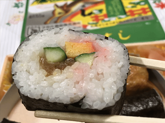 かんぴょうと玉子焼きも一緒にした海苔巻きです。でんぶのピンク色も鮮やかに、巻き寿司は奇をてらわずに、直球勝負で来た感じです。