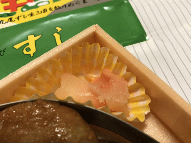 チーズ寿司の「反対側」に入っているのは、チャーシューです。これも、お寿司駅弁としてはあり得ない寿司ネタであり、極めて今風に表現したら、「マジ卍!」という感じでしょうか・笑。当時の調理人のぶっ飛び度合いに、真面目に驚きます。