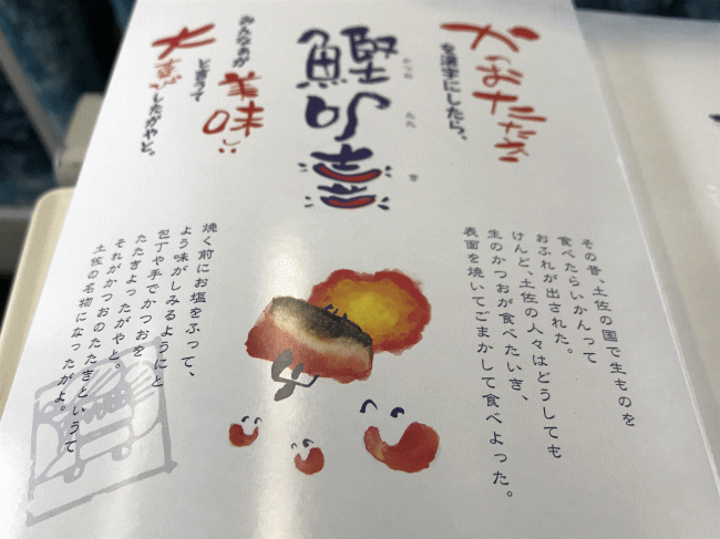 乗車しているのは特急南風の中村行きです。車内で駅弁を食べる事ができるのが、最高に嬉しいですね。かつおたたき弁当の外箱には、このような事が書かれていました。
