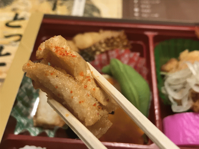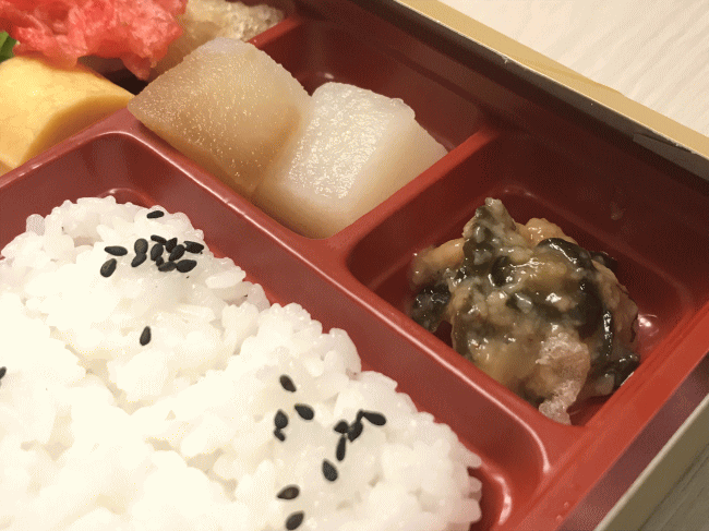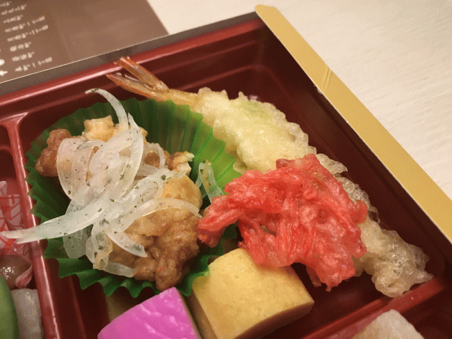 おかずの部分を見てみましょう。右側から。紅生姜の天ぷらが非常に印象的ですね。これ自体が、駅弁としても通常の食事としても普段はなかなか出てくる事がありませんから、非常に気になる存在になって、この駅弁を印象付けています。