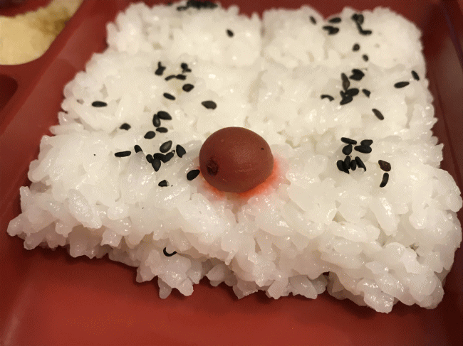 | ・白飯 ・煮物(篠田真、大根、椎茸、人参) ・天ぷら(いも、えび、紅生姜) ・鶏唐揚げと玉ねぎの南蛮漬け ・梨の酒煮 ・するめの麹漬け ・玉子焼き |