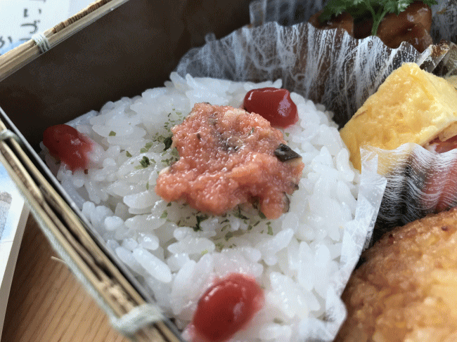ご飯は、おにぎりが2つ。こちらのおにぎりに乗っている明太子には、エリンギを刻んで入れるといった手の込みようです。お米は、新庄産のつや姫を使っているとの事。