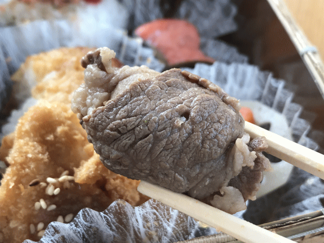 いわゆる「駅弁マーク」の付いた「正式」な駅弁にも、牛肉弁当、あるいはすき焼き弁当がいくつかあります。しかし、明らかにこの「非公式」の山形牛すき焼弁当のほうが、クオリティとしてはかなり上位に位置するような気がします。