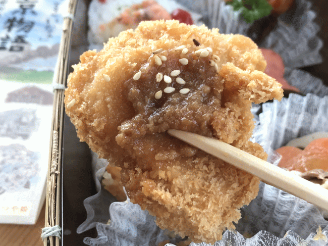 味噌焼きおにぎりです。素朴さよりも、上品さをそこはかとなく感じますし、味噌ならではの旨味もバッチリです。味噌焼きおにぎりの隣は、新庄産のさくらんぼ鶏を使用した鶏味噌かつです。