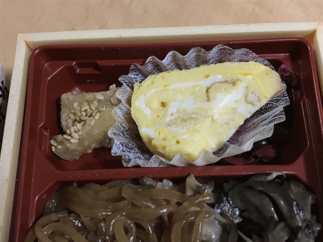 副菜として、牛蒡煮に玉子焼きです。玉子焼きが、手作り感に溢れていました。