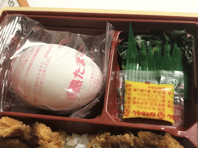 こちらは、以前のバージョンです。写真ではなくて、イラストが描かれていますね。トンカツがメインのお弁当なのに、半熟玉子で主張している状態です。これはこれで楽しい外観ですが、一般人目線で考えると、リニューアル後の松浦の味噌ヒレカツ重の方が、やはり良いような気がします。