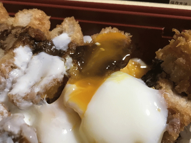 このように、黄身と白身がとろりと溶け出して、味噌カツと渾然一体となります。